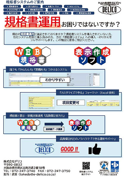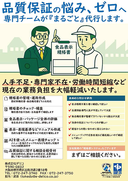 『大企業様における規格書の管理方法』、『中小企業様における規格書の管理方法』、『零細企業様における規格書の管理方法』、は、いずれも同じではありません。デリコは多方面の食品企業様とのこれまで積み重ねてきた実績から、御社に見合った原材料規格書の回収、原材料規格書の管理、原材料規格書の精査、商品規格書の作成、栄養成分計算、表示案の作成 などを提案できるものと自負しております。これこそがデリコのコンサルティング力です。